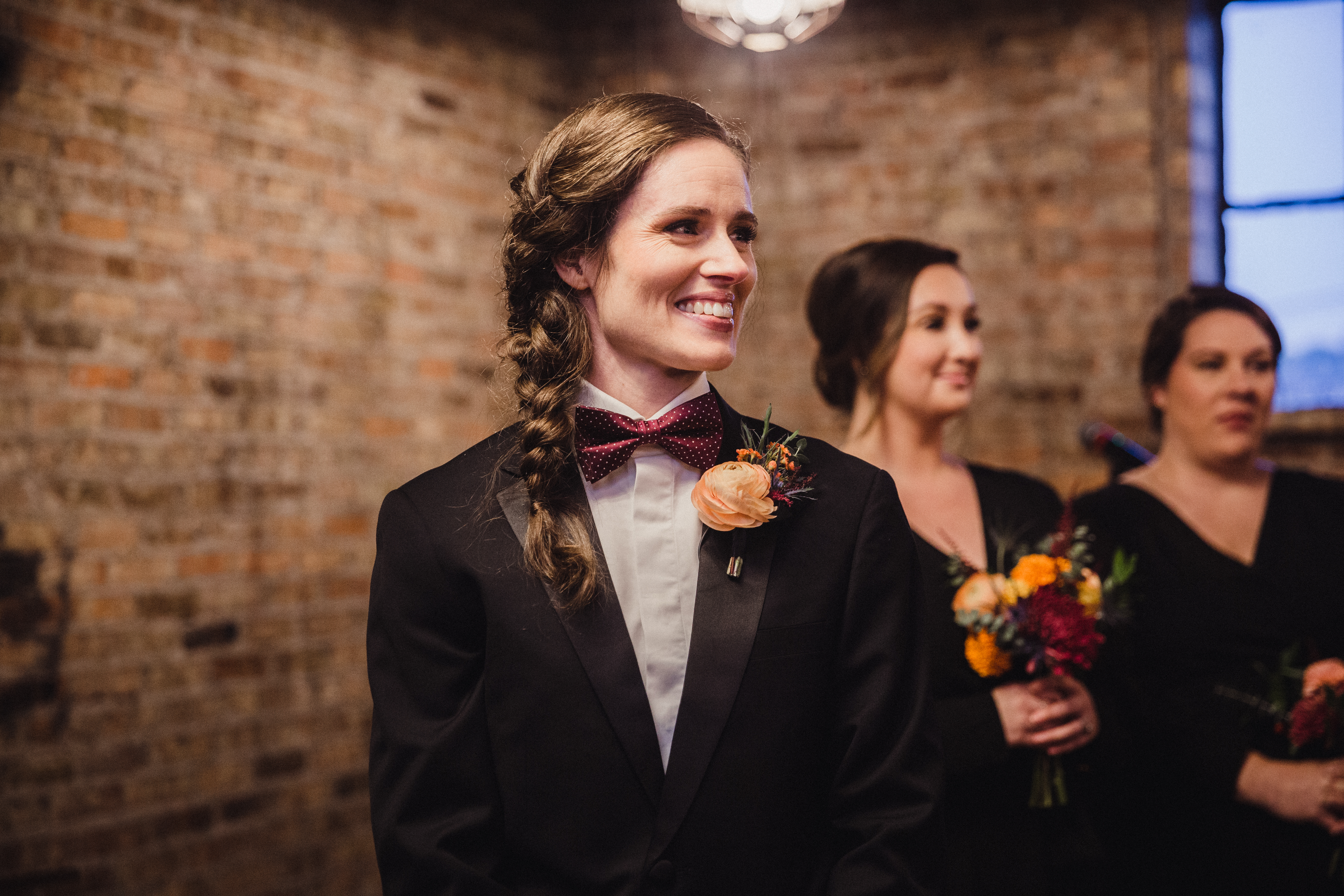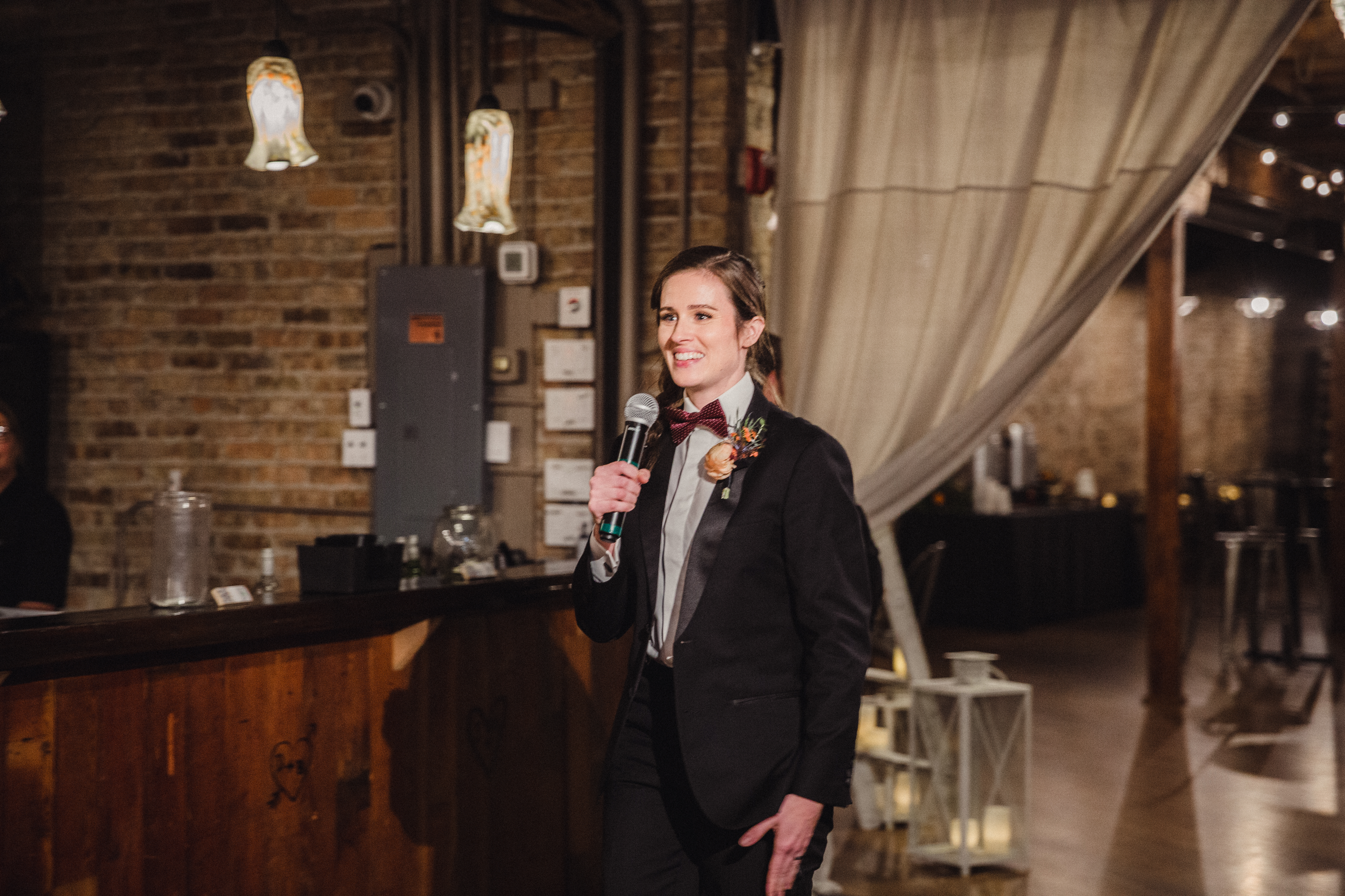 Emily got her tux from The Suit Shop. Her shirt was from Suit Supply and her bow tie from The Tie Bar. Her shoes were made by Cole Haan.